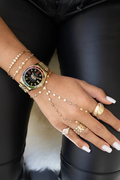 “Our new Cosmic Nights timepiece is a playful piece that feels like pure magic. Black onyx holds such protective, stabilizing energy. When it’s paired with rainbow baguette crystals, it becomes a symbol of possibility. To me, this watch feels like carrying the night sky on your wrist…a talisman of magic, protection, and the infinite beauty that surrounds us when we choose to see it.”