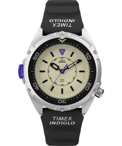Built at a big and bold 46mm, the original 1995 Intrepid had all the presence of a tactical dive watch. For this edition, Brynn downsized the silhouette with a more gender-neutral 36mm case size that reflects her own style: timeless, clean, and genderless. “Without pitch-perfect styling, bigger watches can be hard to pull off,” she says, “so I wanted something smaller and more wearable for all wrist sizes.” She also hit the second hand, hour markers, and dedicated INDIGLO® pusher with her signature pop of purple. A cream and black dial reflects the era’s love of clean contrast, while the skeletonized hour and minute hands and unique crown placement keep things fresh.