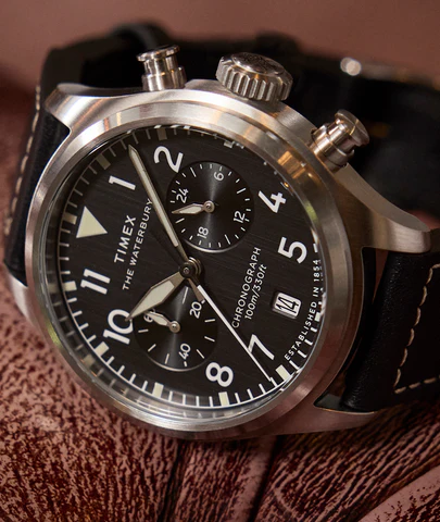 Available in 3-hand and chronograph options, this updated Waterbury takes inspiration from the great aviators of the past while embracing the reliability and craftsmanship that Timex has stood for since 1854. From the curves of the iconic pilot-style case to the functional, minimalist dial, every detail captures the spirit of American ingenuity and the timeless charm of aviation’s golden age.