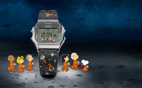 And last but not least: the Timex x Peanuts® T80 Peanuts Space. This one features the whole Peanuts gang suited up for space travel on its lens and flexible black resin strap.
