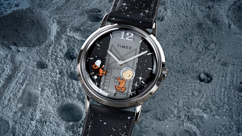 The Timex x Peanuts® Marlin® Hand-Wound Space watch features the same clever second hand design, with Snoopy and Charlie Brown floating around the graphic dial to capture the magic of zero gravity right on your wrist.